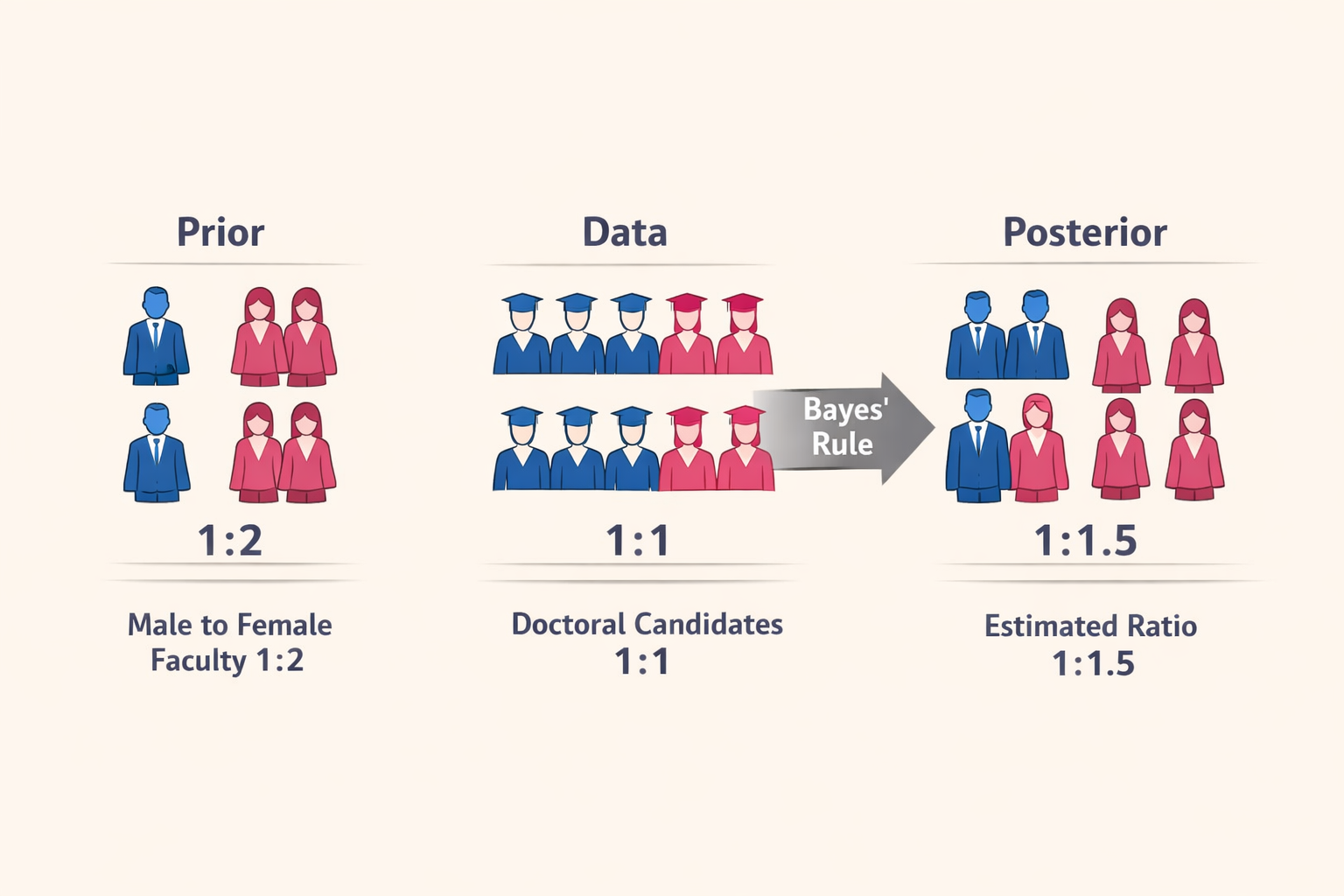 The ratio of male Asian faculty to female Asian faculty is about 1:2 (Prior). We obtained information from 2000 doctoral candidates suggesting the gender ratio is 1:1 (Data; Likelihood given the true ratio we don’t know). Based on Bayes’ rule, the estimate for the ratio is probably 1:1.5 (Posterior) after combining these two statements.