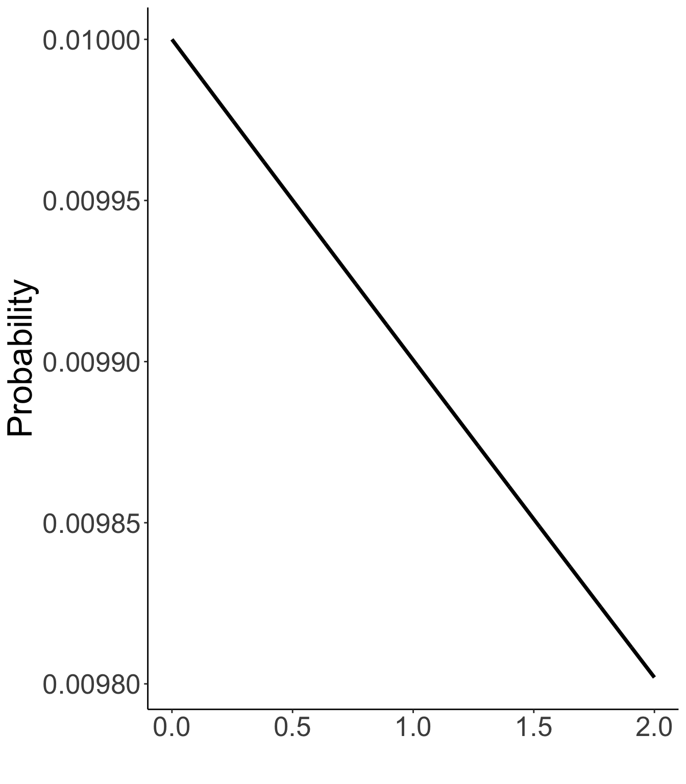 y = dexp(x = seq(0, 2, .001), rate = .01)