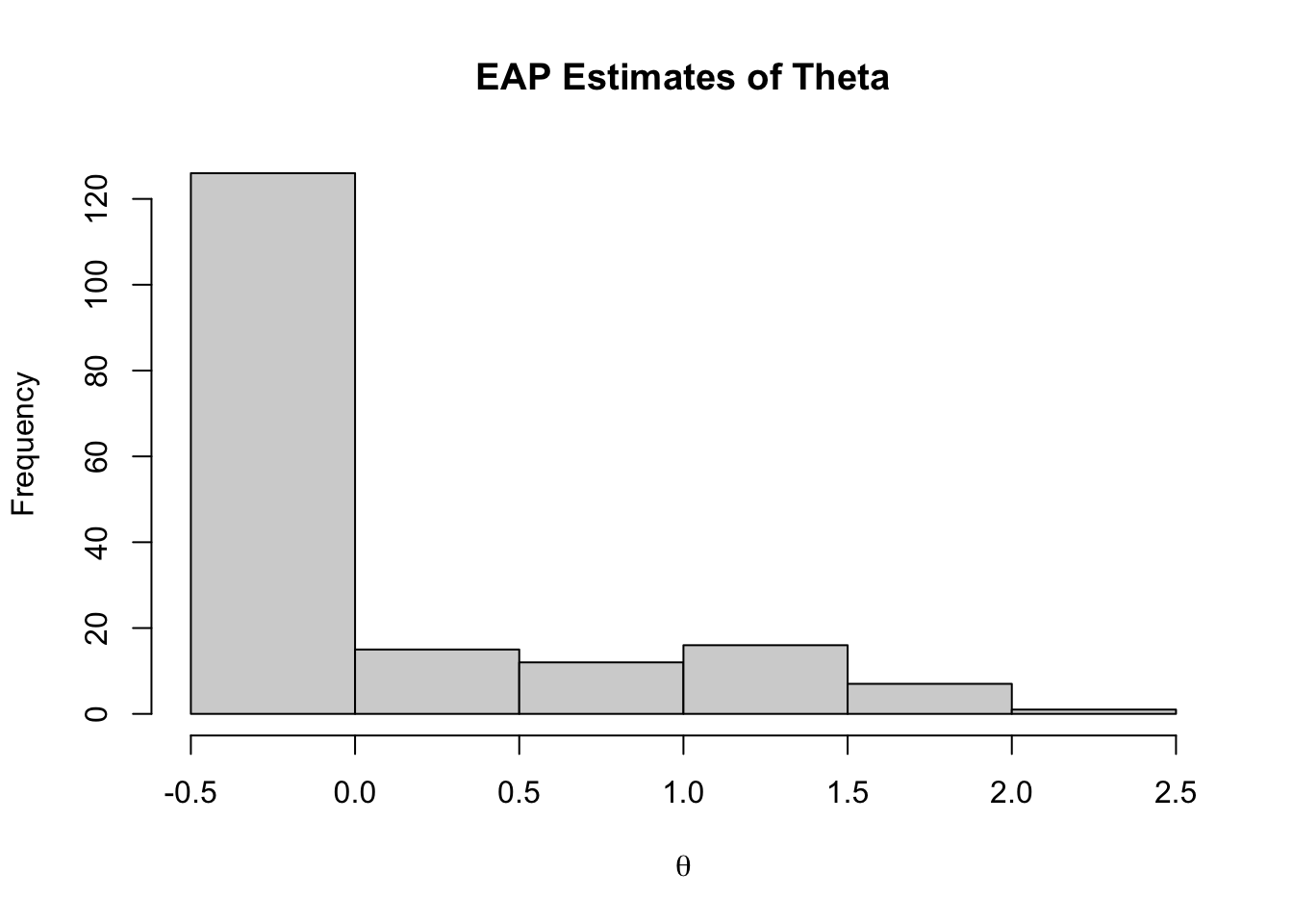To show dichotomous-data models with our data, we will arbitrarilly dichotomize our item responses: