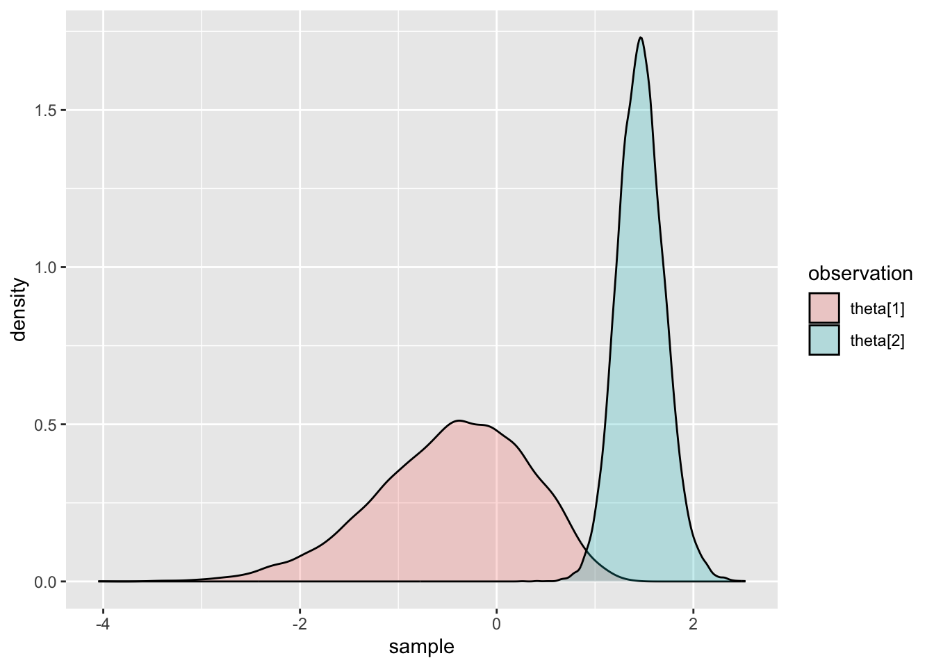 model { lambda ~ multi_normal(meanLambda, covLambda); // Prior for item discrimination/factor loadings mu ~ multi_normal(meanMu, covMu); // Prior for item intercepts theta ~ normal(0, 1); // Prior for latent variable (with mean/sd specified)for (item in1:nItems){ Y[item] ~ bernoulli_logit(mu[item] + lambda[item]*theta); }}