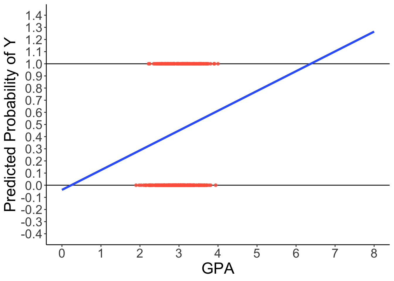 as.data.frame(cbind(GPA = new_data$GPA3+3, P_Y_0 = Pred_prob[,1], P_Y_1 = Pred_prob[,2])) |>