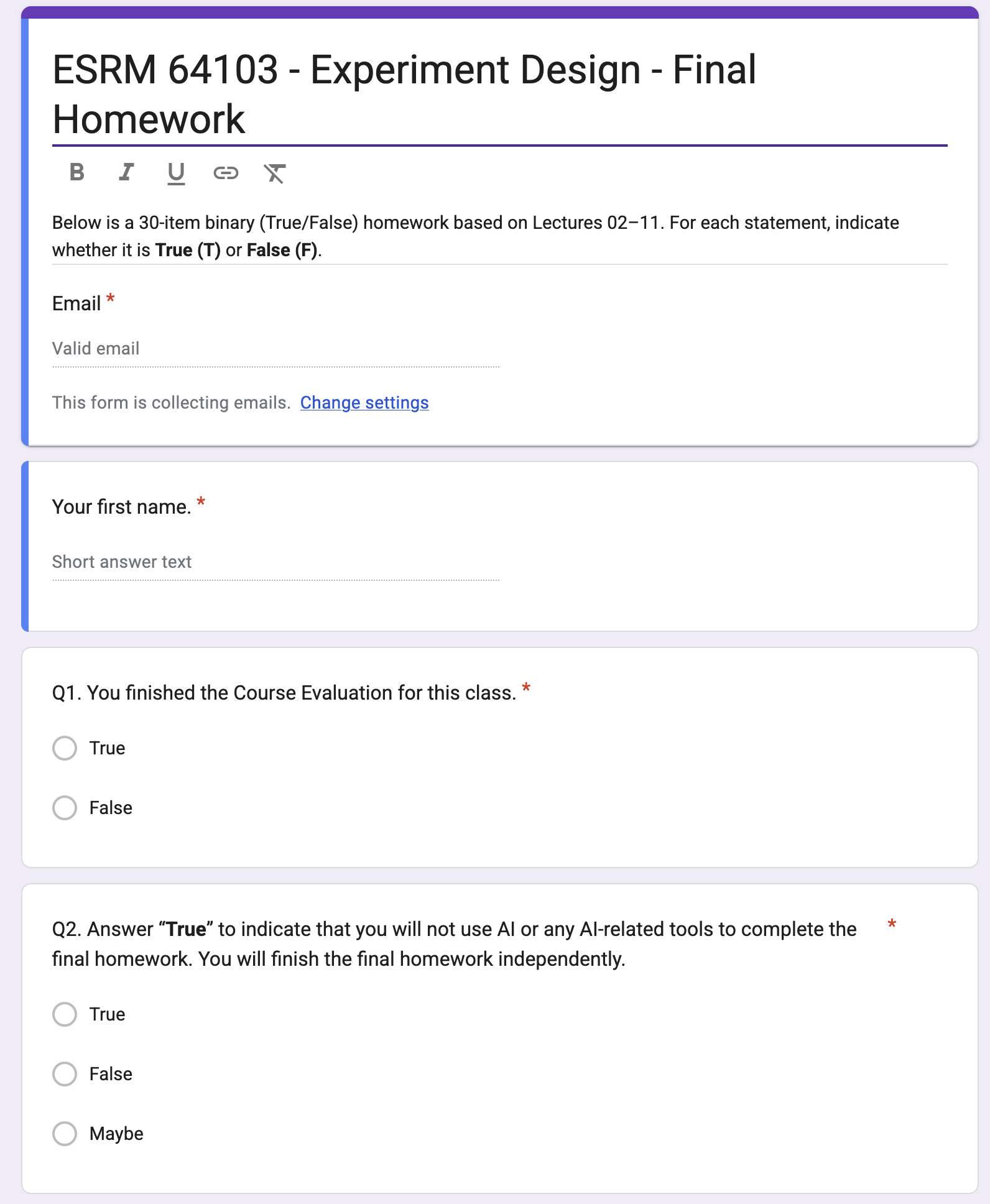 - ESRM 64103 — Experimental Design: Acquire skills in designing educational research.