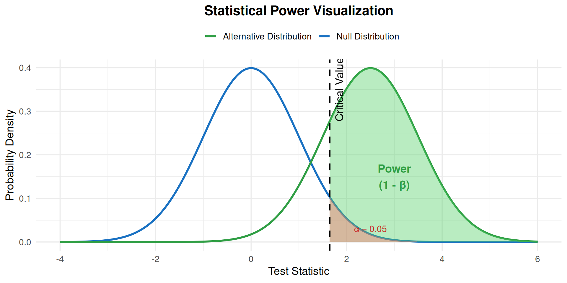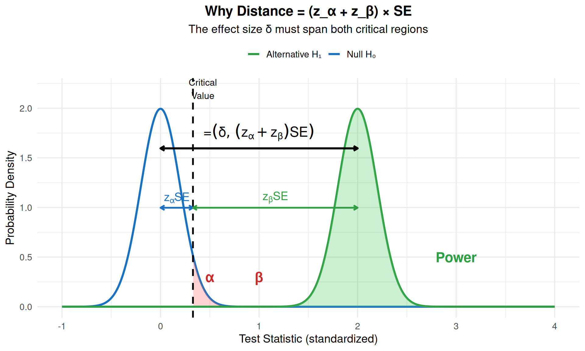 The distance between distributions (in standard error units) must span both critical values: