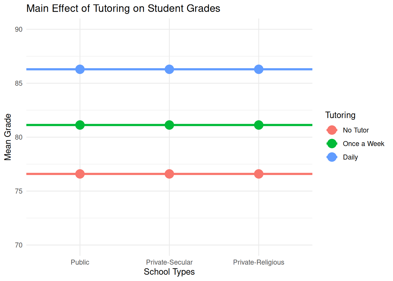 - **Research purpose**: to examine the effect of tutoring program (no tutor, once a week, and daily) AND types of school (e.g., public, private-secular, and private-religious) on the students’ grades
