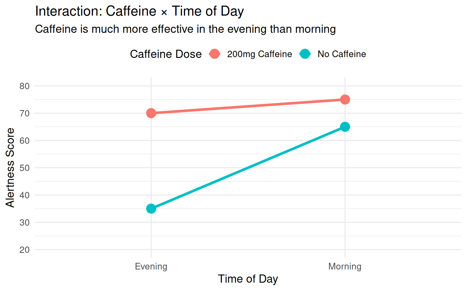 - **Interaction Effect**: When the effect of one factor changes depending on the level of the other factor