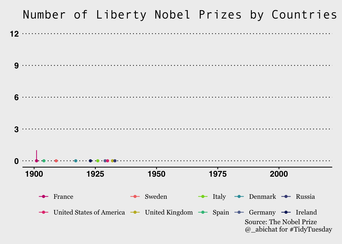 ggplotpackage to visualize some fun data. In this post, I tried to play with a Nobel Prizes Data including countries, prize year, each prize. The goal is to plot a cumulative traceplot of Liberty Nobel Prizes for top 10 countries.