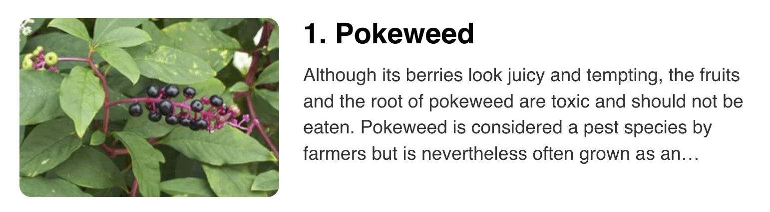 对土壤要求不严,常生于疏林下、路旁和荒地,在营养条件较好时,植株高可达2米,主茎有的能达到3米,可与其他植物竞争养料。垂序商陆全株有毒,根及果实毒性最强,对人和牲畜有毒害作用,由于其根酷似人参,常被人误做人参服用,误食后会出恶心呕吐、口胃灼热、腹部抽搐、腹痛腹泻、头痛眩晕、神志恍惚等症状,甚至会因心肌麻痹而死。