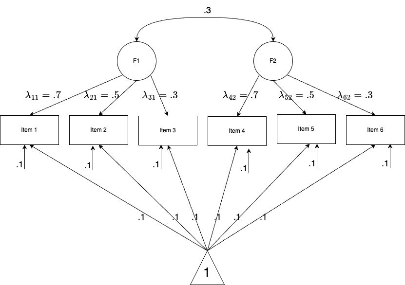 The factor correlation (Psi = .3) is represented by the non-diagonal elements of factor correlation.