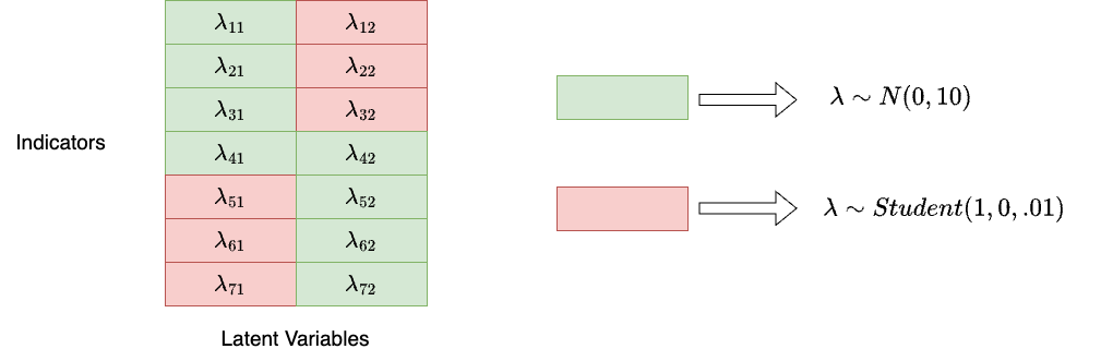 The general idea is that we assign a uninformative prior distribution for “main” factor loadings, and assign informative “close-to-zero” prior distribution for “zero” factor loadings: