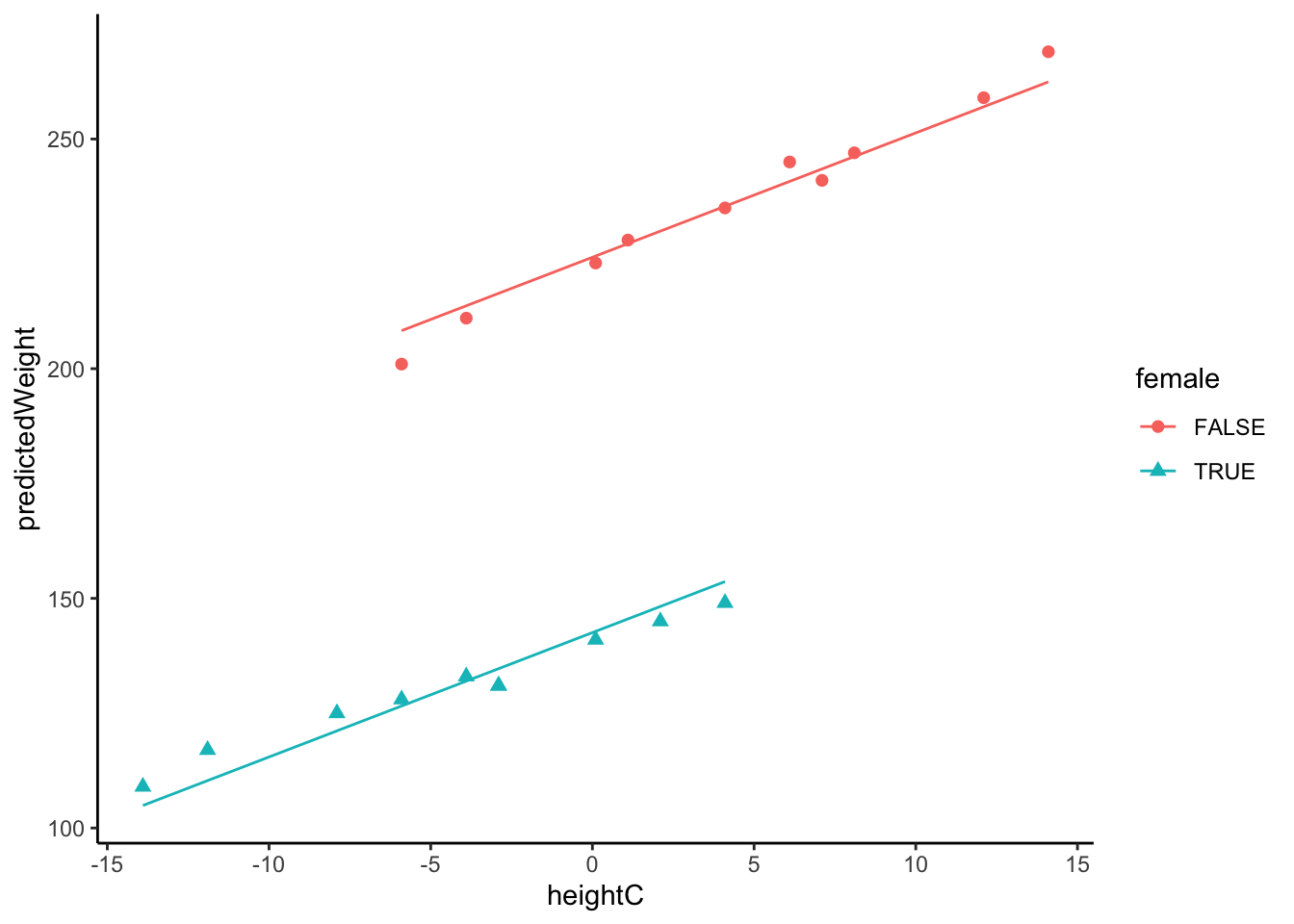 \text{Weight}_p = \beta_0 + \beta_1 \text{HeightC}_p + \beta_2 \text{Female}_p +\beta_3 \text{HeightCxFemale}_p+ e_p