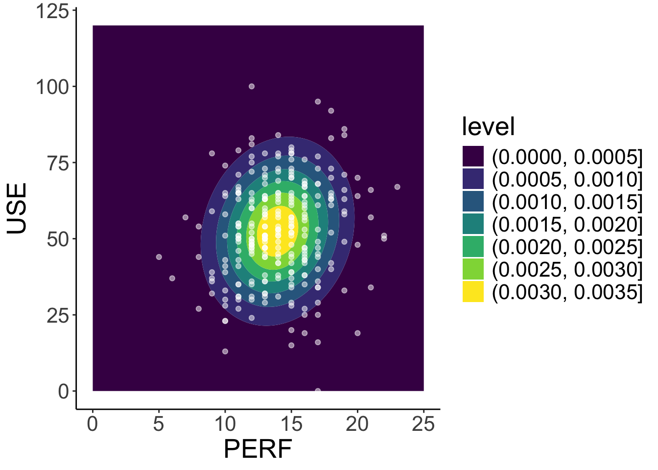 geom_contour_filled(aes(x = perf, y = use, z = density), data = sim_dat) +