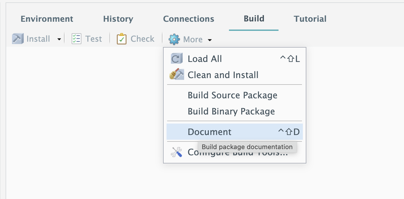 document()or clickBuild>document, the roxygen2 package will convert the help information into.Rdfiles.These help files will ultimately be moved to a folder called