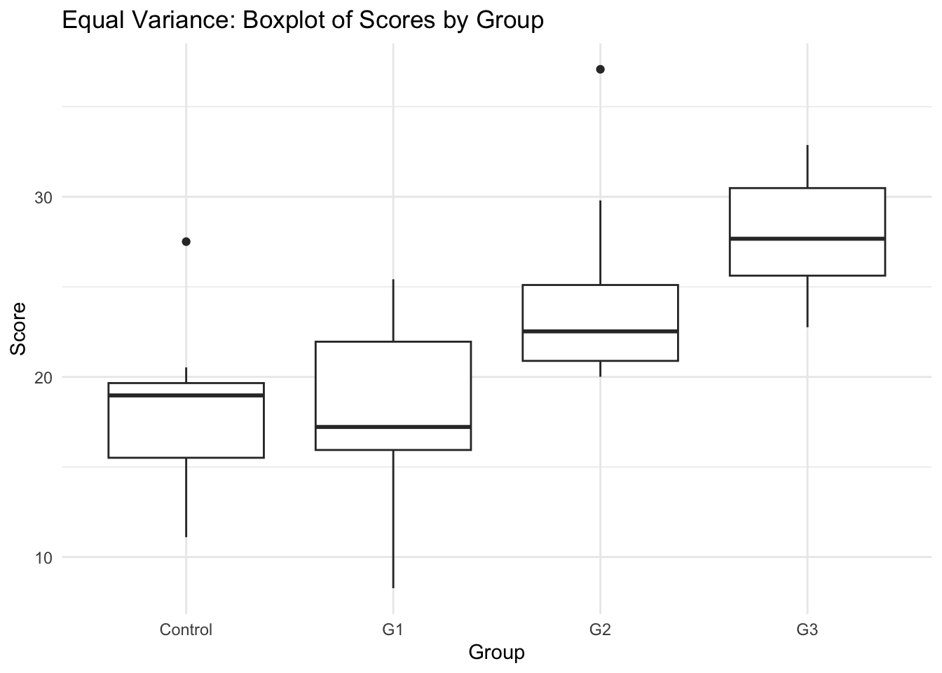 labs(title = "Equal Variance: Boxplot of Scores by Group", x = "Group", y = "Score")4.4.1.2 Unequal Variances across groups