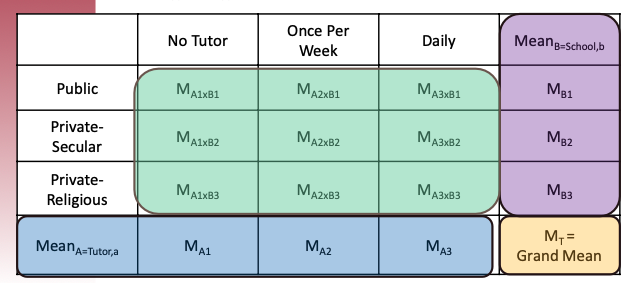 - **Research purpose**: to examine the effect of tutoring program (no tutor, once a week, and daily) AND types of school (e.g., public, private-secular, and private-religious) on the studentsโ grades