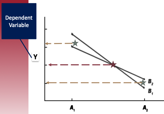 : Occurs when the effect of one factor on the DV depends on the particular level of the other factor