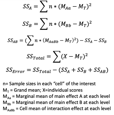 - Interaction: $SS_{AB} = (\sum n_{ab} (M_{AaBb} - M_T)^2) - SS_A - SS_B$
